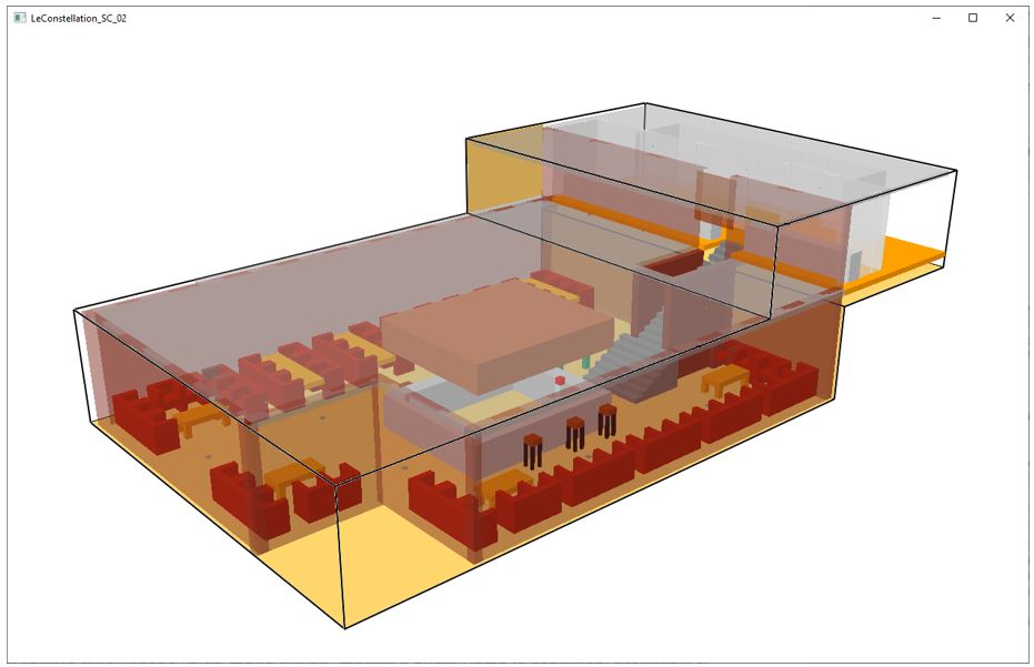 Ai fini della simulazione, l’ambiente è stato modellato come un singolo compartimento principale, con aperture rappresentative di porte e collegamenti con locali soprastanti.