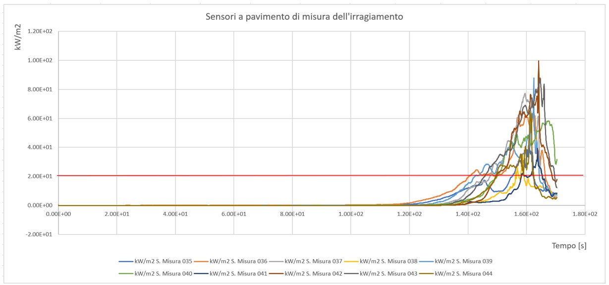 Premesso che la ISO TR 13387-2 ’’Fire Safety Engineering – Part 2: Design fire scenarios and design fires’’ indica che il FLASHOVER è una fase di transizione in corrispondenza della quale la temperatura dello strato di gas caldi a soffitto raggiunge il valore di 600 C° e il flusso termico a livello del pavimento è pari a 20 kW/m2, nelle figure seguenti sono indicati: i valori del calore trasmesso per irraggiamento, misurati da sensori virtuali posizionati a filo di pavimento e i valori delle temperature misurati sempre da sensori virtuali posizionati immediatamente al di sotto del soffitto. I valori riportati evidenziano che le condizioni di Flashover si verificano dopo circa 140 s.