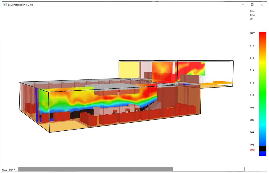 La simulazione numerica è stata sviluppata esclusivamente nell’ambito di uno studio di Fire Safety Engineering a carattere prestazionale e deve essere interpretata come valutazione tecnica esplorativa basata su ipotesi ragionevoli ma necessariamente semplificative.