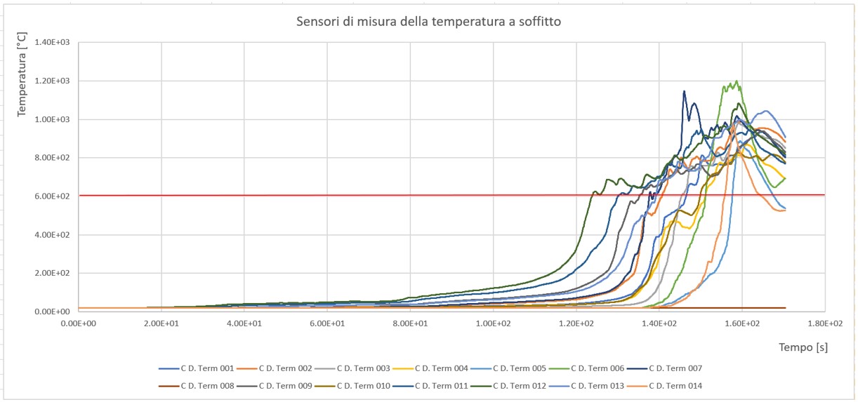 Le temperature a soffitto raggiungono valori elevati, potenzialmente critici per la stabilità degli elementi sia strutturali che non strutturali. A quota uomo, le temperature rimangono entro limiti accettabili solo per un intervallo di tempo limitato (circa 140 s).